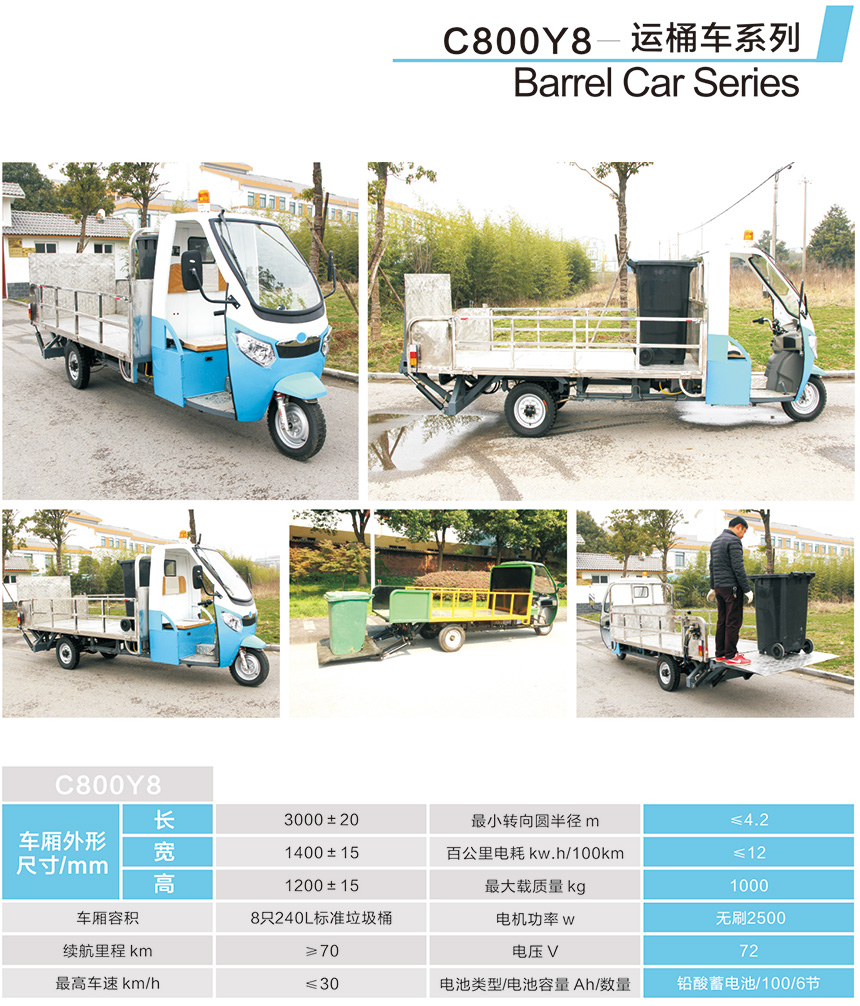 C800Y8电动运桶车根据环卫工人群体,操作能力等量身设计,车辆使用方便,对路况要求低,车身小巧可随时停放,其适用的范围也比较广泛,可用于城市环保建设,街道垃圾处理,社区物业保洁,高尔夫球场垃圾清理,校园保洁工作,游乐场,旅游景区,公园等保洁工作!